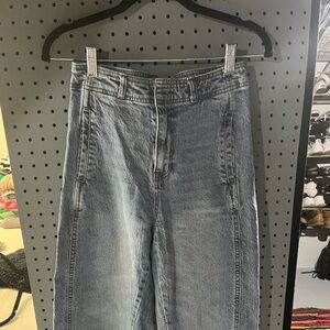 Love love these jeans and the style, they’re just a little too small on my hips. Worn twice. Have an adjusting feature in the back for the waist and fit high waisted with a wide leg style. I’m 5’3 and would usually cuff them at the bottom with a flat shoe.