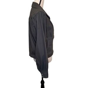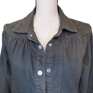Darling, trucker style jacket with a feminine twist. Full sleeves, gathers and cropped length add charm and character to an otherwise utilitarian jacket. In excellent condition.