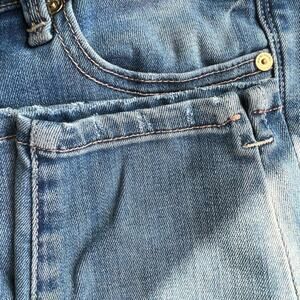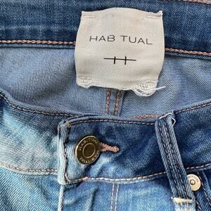 Habitual distressed marina jeans, size 27”, distressed details, medium wash, small vented detailing on bottoms, approximate measurements inseam 27”, rise 9”, waistband flat 15”.