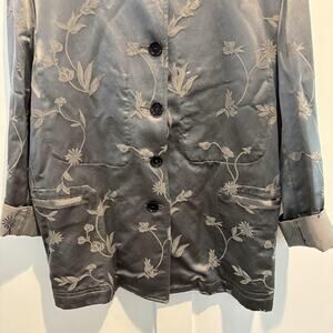 Womens jacket in a gray/silver tone with an allover tonal floral jacquard pattern and subtle satin sheen.