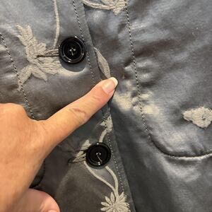 Shows a small fabric pull near the front button placket (see close-up), and slight wear at the side vent and hem edges. In otherwise very good condition. All buttons present and pockets intact.