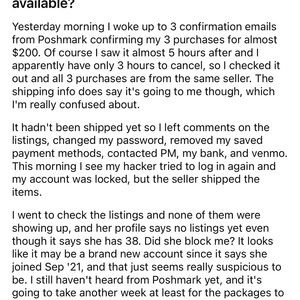 This account hacked my Poshmark and made offers to buy something I never saw! Contacted PM and my debit card company already. Users of Poshmark please beware! I Googled this and find out these accounts are fake, and they are the hackers. Basically they breached your account with some technique, and buy items on their fake page.