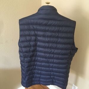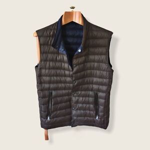 This is a super lightweight and stylish down gilet. Reversible with colours blue and brown with pockets on each side - well thought-out! The brown side has zippered pockets, the blue side has buttoned pockets. It is very understated as you would expect from a luxury item. Just exquisite! Hackett is the official sponsor of Aston Martin Racing.