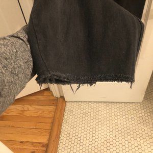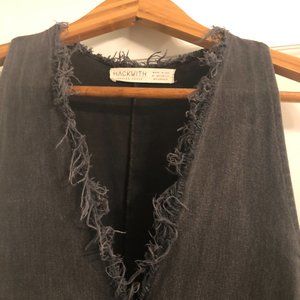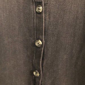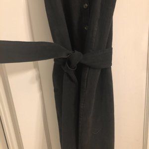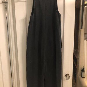 Sturdy, washed-black cotton jumpsuit from Hackwith Design House with removable belt (no belt loops)--I usually wore without the belt. Super soft and comfy. Deep V-neck with buttons for easy on/off. Frayed edges on legs and v-neck. I am 5'10" and it is cropped on me--hits about mid-leg but if you're shorter it will be longer. Has pockets, too!