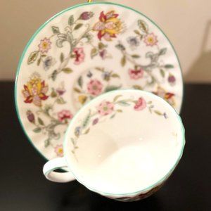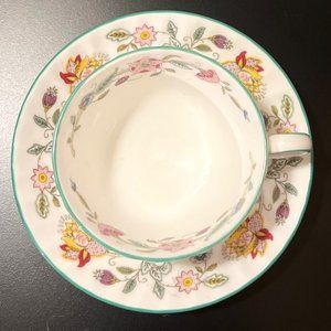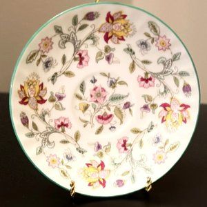 Minton Haddon Hall B1451 green trim. This floral chintz pattern, with embossed swirl, was produced from 1948 and 2011.