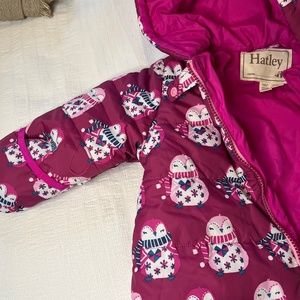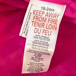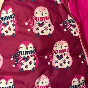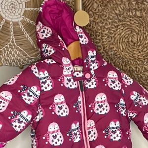 Hadley Baby Girl Puffer Snowsuit, Size 18-24, Pink Owls, Gently Used no wear, 100% polyester (lightweight, silky)