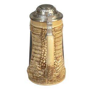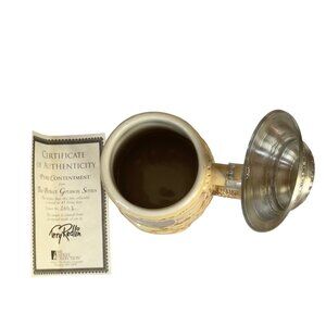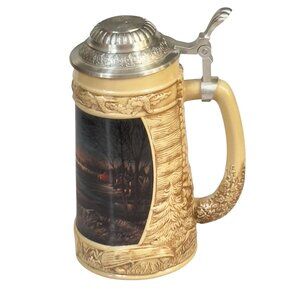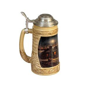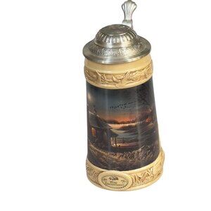 This limited edition beer stein designed by Terry Redlin is both a collectible and a functional piece. It features intricate woodland scenes and a secure lid, perfect for enjoying cold beverages.