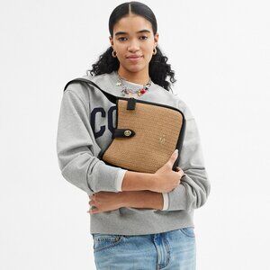 Straw and refined pebble leather Inside zip pocket Turnlock closure fabric lining Adjustable strap with 20 1/2 drop for shoulder or crossbody wear 9 3/4 (L) x 9 1/2 (H) x 3 1/4 (W) Style No. CAL93