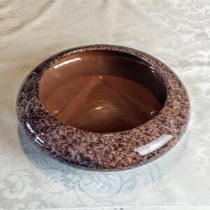 Haeger Pottery "Ming Saucer" round ceramic glazed planter with a solid medium brown interior and rich exterior in shades of brown, mauve pink and grey.