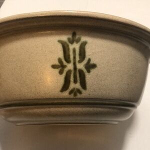 EUC mixing bowl to add to your collection or as a gift. Design is olive drab green and on opposite ends and also green around bottom of bowl. Beige oatmeal color all around. Only has minor wear as shown and mark on top of bowl as shown.