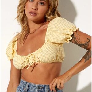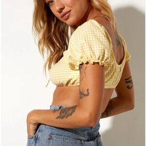 Freshen up your crop collection with some gingham. Our Haenji top features a super cropped fit with tie up detailing and short sleeves in a lemon yellow gingham print. Keep this look casual with a denim pairing.