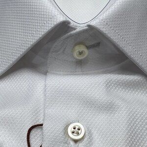 Classic and refined, this Hagen Dobby Dress Shirt features a crisp white finish with a subtle textured weave and elegant French cuffs. Crafted for a tailored fit and timeless sophistication, it’s perfect for pairing with suits or tuxedos — an ideal choice for formal events, business occasions, or black-tie attire.