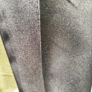 These men's dress pants by Haggar are in a solid navy color and feature a zip closure. The expand-o-matic design provides comfort for a size 40 waist and 31-inch inseam. With a regular fit and straight leg style, these polyester pants are suitable for casual, formal, or business occasions. Although one back button may be missing, these pants still offer practicality with pockets and are versatile for all seasons. Pant leg width is 10 inchs and front with zipper is 16 inches.
