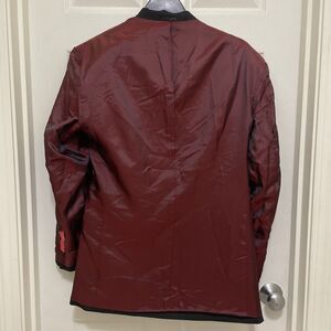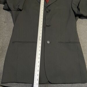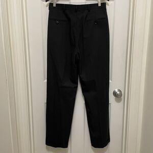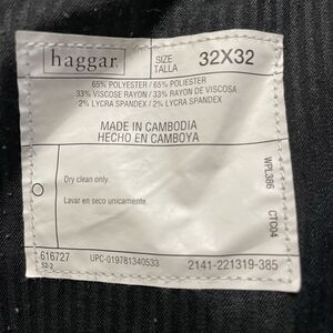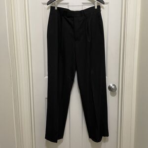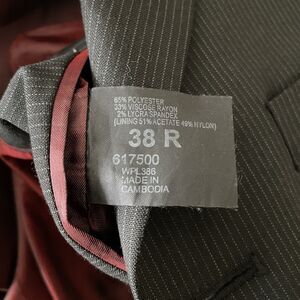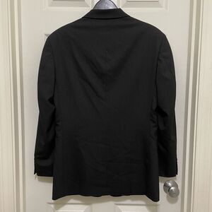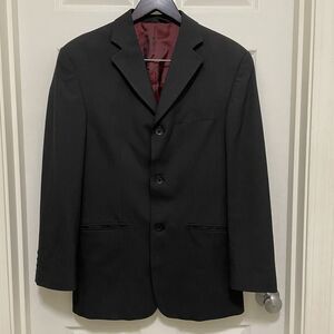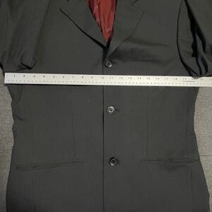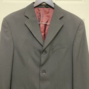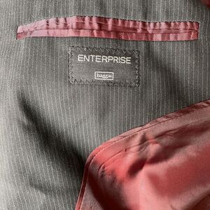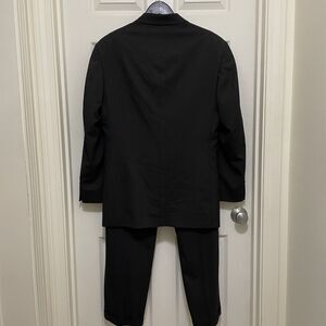 This is a Haggar Enterprise 2 piece black suit with white pinstripes. It is in excellent preowned condition. The jacket is a 38R and the pants are a 32 X 32. Actual measurements are included in photos. This would be great for prom, a wedding or for business. The pants are pleated at the waist and cuffed at the bottom. The jacket has 3 buttons and has two functioning pockets on the outside and 2 inside as well.