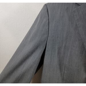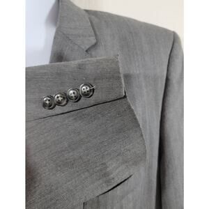 gray, fully lined, inside pockets, outside pockets (still sewn shut), notched collar, front breast pocket, lightweight, soft, shoulder pads, vented back seam2 button closure