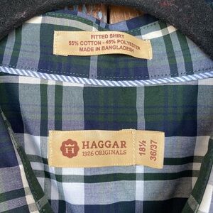 Here is a nice Haggar Green Plaid Long Sleeve Button Down Shirt size 18.5 or 36/37 as shown on tag. It is in good used condition. Measurements are approximately 34.5 inch length, 28 inch sleeves and 27 inch width from pit to pit when flat.
