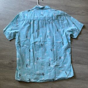 Light blue shirt with playful hula dancer pattern. Short sleeves. Ideal for casual wear.