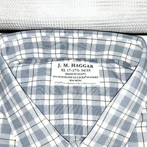 Elevate your wardrobe with this stylish Haggar Performance dress shirt. Featuring a collared neckline, button-down closure, and barrel cuff style, this shirt is perfect for both casual and business occasions. The shirt is made of a blended polyester/spandex fabric with a white-grayish blue check pattern, offering both comfort and flexibility with a stretch feature.