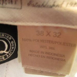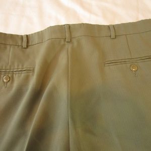 Haggar men's dress pants, sz 38X32 relaxed fit, pleated front, no slip waistband,cuffed legs,beautiful green in color, 100% polyester, very soft and almost looks like linen, button, 2 clasp & zipper closing, 2 back button pockets, 2 front pockets, rise is 13", waist is 19" side to side, machine wash, no iron care. Pre-owned great shape, no rips or stains or flaws. (0057)