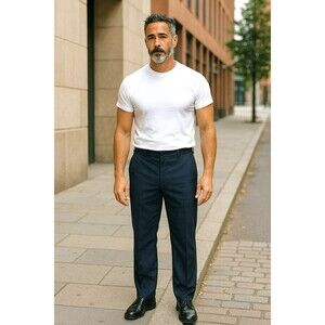 The Haggar Men's Size 34 x 30 Navy Blue Chino Dress Pants are a versatile addition to any man's wardrobe. Made from comfortable and wrinkle-resistant polyester fabric, these straight leg pants feature a flat front with a zip and button closure. Elastic insets in waistband. The high rise waist and slimming features make them suitable for various occasions including workwear, casual outings, and parties. With belt loops, pockets, and a solid blue color, these pants offer both style and functionality. Perfect for year-round wear! Gently preowned. Photos are the item you will receive (except model photos, which can be slightly different)