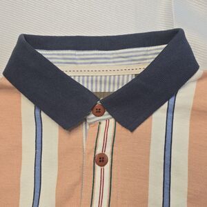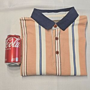 Crafted in Pakistan from breathable 100% cotton, this Haggar polo has never been worn and still carries its original tags. It features a classic three-button placket with short sleeves, and the interior collar is lined with a blue-and-white striped contrasting fabric that adds a touch of extra style. The peach base with multicolor horizontal stripes creates a versatile look, suitable for casual wear, golf, or weekend leisure. With its BNWT status, the buyer will enjoy this polo in pristine condition, exactly as it came from the store.