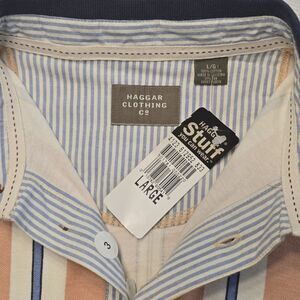 Brand new with tags Haggar men's polo shirt, size L soft 100% cotton in peach with multicolor stripes and contrasting collar detail.