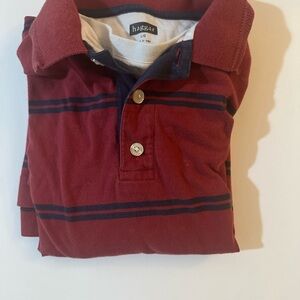 This Haggar polo shirt showcases a striking red color complemented by bold black stripes, creating a dynamic look. The classic polo collar and short sleeves make it an ideal choice for both casual and semi-formal occasions. A subtle brand logo on the chest adds a touch of elegance to this versatile piece.