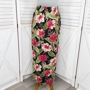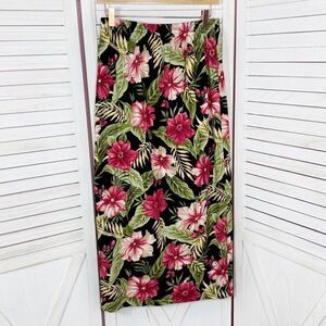 Haggar Vintage Linen Tropical Flower Print Button Front Maxi Pencil Skirt Black Pink