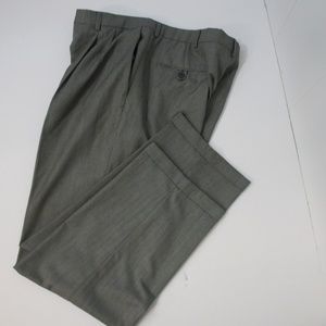 Haggar men's dress pants, sz 38X32 relaxed fit, pleated front, no slip waistband, cuffed legs, gray in color, button, clasp & zipper closing, 2 back button pockets, 2 front pockets, rise is 12", waist is 19" side to side, dry clean only, Pre-owned great shape, no rips or stains or flaws. 65% Polyester, 35% Viscose Rayon.