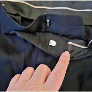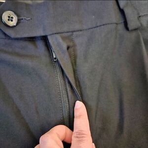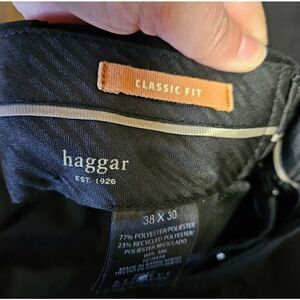 This is a pair of classic fit style black slacks by Haggar. They have a hidden clasp on the fly and buttoned pockets on the back.