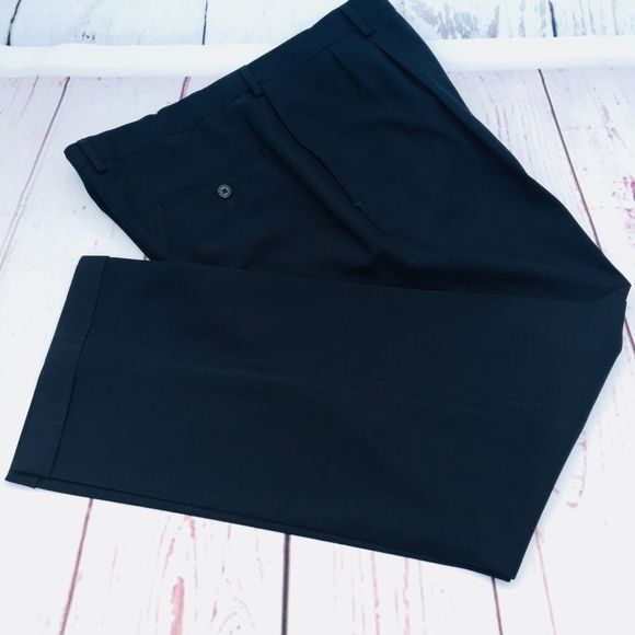 These Haggar black dress pants are a classic fit with cuffed pants. They are 77% polyester and 23% recycled polyester.
