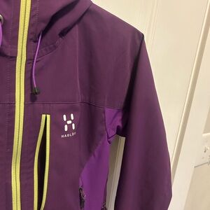 Haglöfs women’s size Small technical waterproof shell in purple with lime green accents. High-performance alpine design with pit-zip ventilation, 4 zip pockets, and a helmet-compatible hood with wired visor.