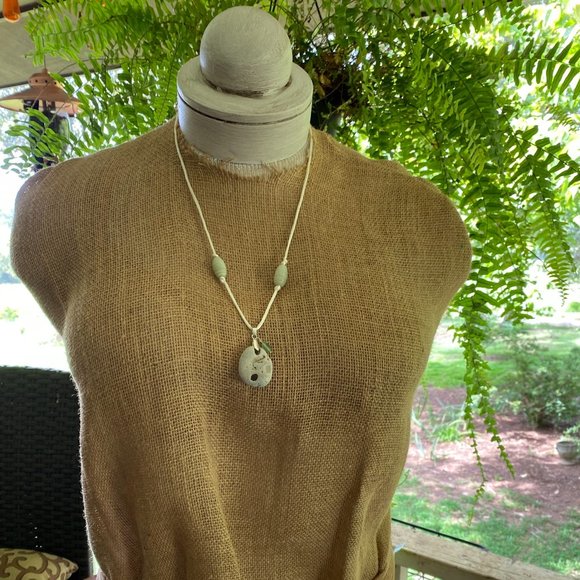Lovely Handmade Hagstone with two handcarved jadeite beads strung on a 24 inch white silk cord, accented with a sea glass green bead and silver findings. It is always good to have a little natural magic around your neck.