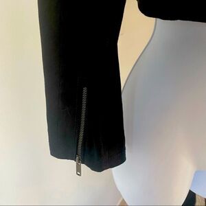 Front zipper closure, dual pockets with zipper, dual pockets with flap, squared neck, long sleeve with zipper on both sleeves