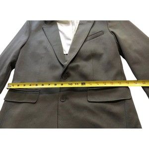 This listing is for a preowned Haight & Ashbury Canada in a pale green/gray/beige neutral small dot pattern in men's size 38. It has a notch lapel, two-button closure, and there are a few small inner pockets as well. The shell is a rayon/spandex/polyester blend. It measures about 17" across the shoulder seams, about 19" across the chest, about 18" across the waist, about 21" across the bottom, about 26" long from the shoulder to the bottom edge, and the sleeve is about 25" long, all laying flat.