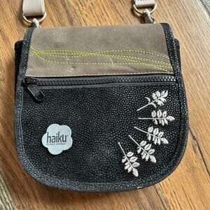 Haiku by Sharon Eisenhauer crossbody bag with adjustable strap. Black textured fabric with brown suede-style flap, accented with green stitching and embroidered leaf design. Front zip pocket, interior compartments, and back slip pocket.