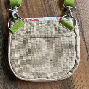 Haiku by Sharon Eisenhauer small crossbody bag with adjustable green strap. Tan canvas body with colorful floral fabric accent and leaf appliqué on the front. Features front zip pocket, back slip pocket, and interior mesh organizer pocket with bright pink floral lining. Compact size, perfect for travel, festivals, or everyday errands.