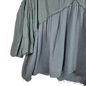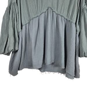 Features a relaxed, oversized fit with flowy silhouette, V-neckline, and billowy long sleeves with gathered cuffs. Top half is a lighter green; the lower section is a dusty blue with a textured crinkle gauze look. Raw hemline at the bottom for a boho, casual feel.