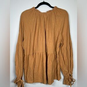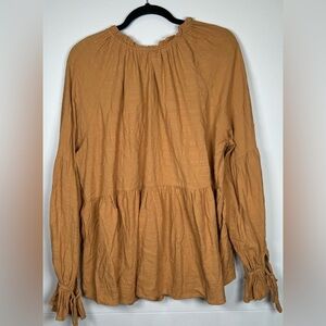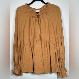 This elegant boho blouse by Hailie & Co. features a ruched V-neckline and long, voluminous sleeves, offering a relaxed and stylish fit. The gold color adds a touch of warmth and sophistication, while the tie front detail enhances its chic appeal. Perfect for both casual outings and stylish workdays. EUC. Pet and smoke free.