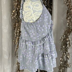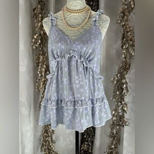 Brand new with tag! Hailey & Co sleeveless ruffle tank featuring a delicate lavender floral print over black & white stripes. Flowy tiered silhouette, V-neckline, and soft ruffle straps for a feminine, breezy look.