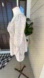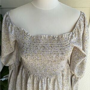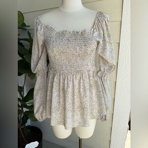 This Hailey & Co top is a lightweight, feminine blouse featuring a smocked bodice that provides a stretchy, form-fitting look through the chest and waist. It has a square neckline with a slightly ruffled edge and long puff sleeves with gathered elastic at the wrists for a soft, billowy effect. The fabric is a white base with a delicate speckled print in shades of yellow, black, and taupe, giving it a subtle, playful pattern. The hemline is slightly flared, creating a peplum-like silhouette that’s flattering and easy to wear.