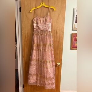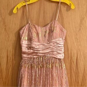 Beautiful pink/coral color with gold sequin pattern. Spaghetti straps. 100% polyester. Lined. Only worn once and still in really good condition.