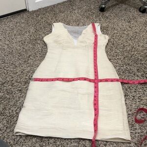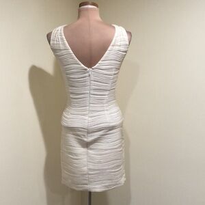 Excellent condition no stain rips or fading. Sleeveless, low cut v-neck with mesh, sheath silhouette mini dress. Zips in back. Stretchy material. Ivory with subtle hood flecks throughout. Wavy pattern.