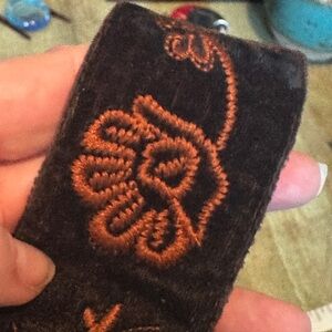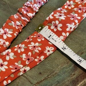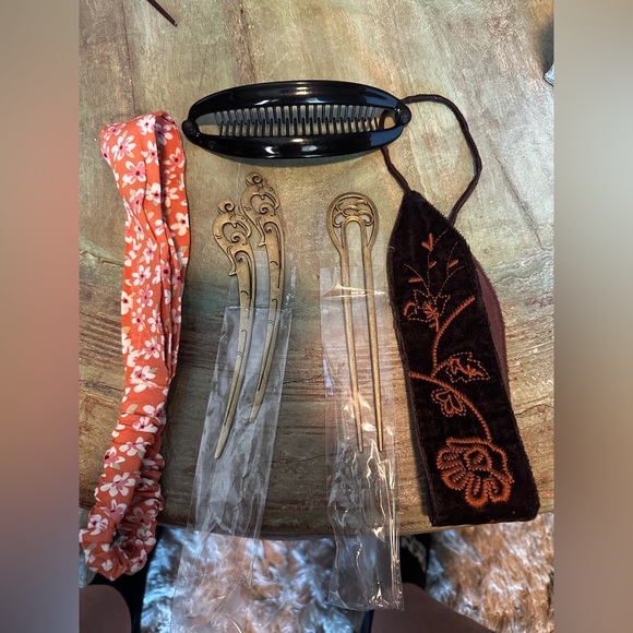 Enhance your style with this fun mixed hair accessories set. Featuring a brand new sleek black comb clip and 3 ornate gold metal hair sticks . Scunci is the brand of the black plastic comb clip. The metal hair sticks do not have a stamp. The flowered peachy head band has never been worn and is in perfect shape. See photo for measurement. Felt brown hair bandanna is a bit too big for my 22 inch forehead. The elastic on that has pulled apart as you can see in the photo. If you have a larger than 22 inch forehead, it will fit you perfectly. I’m basically throwing this in there for free since it’s not in perfect condition, but for someone with the perfect size head or with creativity to re-sew some elastic, it’s a great fun headband that still has plenty of use left in it! Please reach out if you have any questions