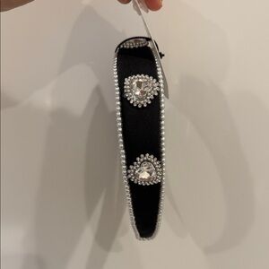 - Elegant black satin fabric headband adorned with heart gems and pearls.