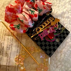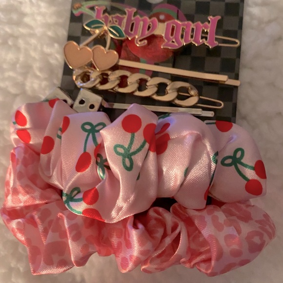 1- pack of scrunchies w/ cherry design it has (2) hair pins and (3) scrunchies