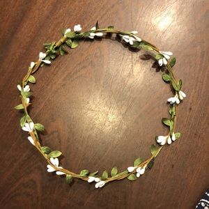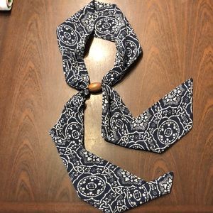 Navy, white, and wooden beaded headband is adjustable with ribbon.