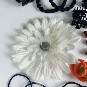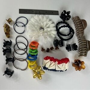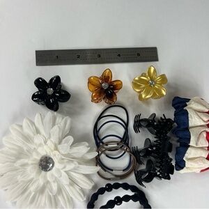 Multi piece hair bundle. This includes soft stretchy colorful bands with rhinestones, a flower clip, multiple claw clips, multiple rubber bands, and one red white and blue hair clip. These are new to gently preowned condition. These come from a smoke free home