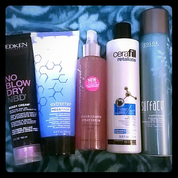 Redken air dry styler for coarse hair, redken extreme mega mask, Kenra color charge spray serum, redken Cerafill shampoo for thinning hair, surface taffy wax finishing spray.