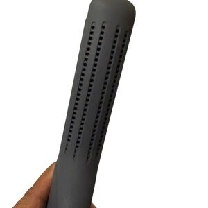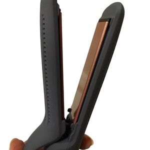 Sleek black hair straightener with gold accents. Perfect for styling.